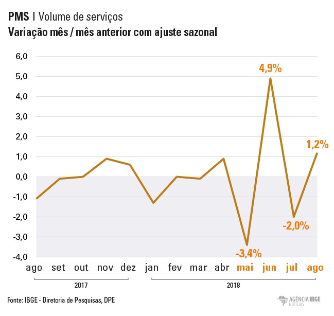 O volume de serviços prestados no Brasil cresceu 1,2% na passagem de julho para agosto deste ano, segundo a Pesquisa Mensal de Serviços (PMS), divulgada hoje pelo IBGE. Com esse resultado, o setor voltou ao patamar que operava em dezembro de 2017.