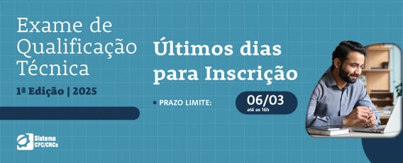 Na próxima semana, termina o prazo para a inscrição na primeira edição do Exame de Qualificação Técnica (EQT) de 2025. Os profissionais de contabilidade terão até as 16h do dia 6 de março deste ano para efetuarem o ato. As inscrições devem ser realizadas no site da Fundação Getulio Vargas (FGV), banca organizadora do certame.