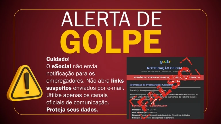 Mais um golpe na praça: empregadores reportaram que receberam e-mails contendo uma suposta notificação do eSocial sobre pendência de atualização cadastral, com a ameaça de suspensão de benefícios dos trabalhadores. É falso.